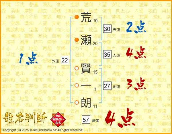荒(10画)瀬(20画) 賢(15画)一(1画)朗(11画)