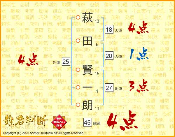 萩田賢一朗さんの総運は45画の4点!
