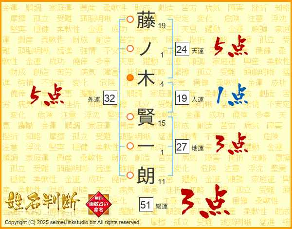 藤(19画)ノ(1画)木(4画) 賢(15画)一(1画)朗(11画)