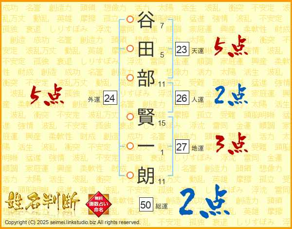 谷(7画)田(5画)部(11画) 賢(15画)一(1画)朗(11画)