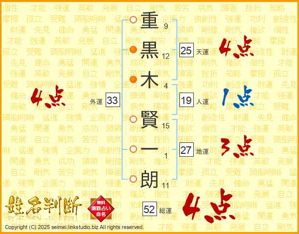 重(9画)黒(12画)木(4画) 賢(15画)一(1画)朗(11画)
