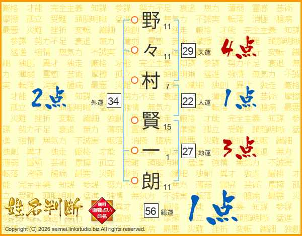 野(11画)々(11画)村(7画) 賢(15画)一(1画)朗(11画)