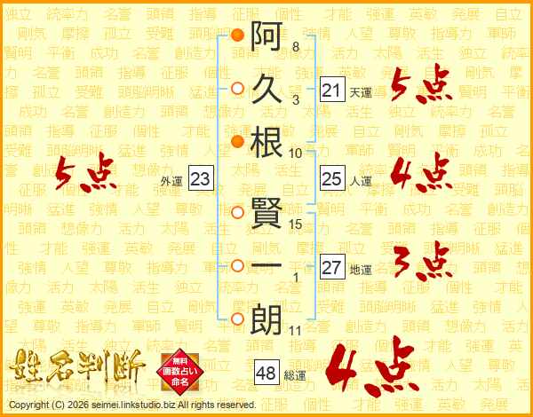 阿(8画)久(3画)根(10画) 賢(15画)一(1画)朗(11画)