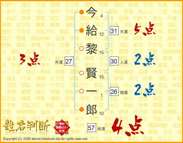 今(4画)給(12画)黎(15画) 賢(15画)一(1画)郎(10画)