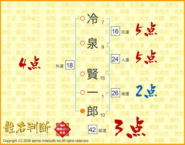 冷(7画)泉(9画) 賢(15画)一(1画)郎(10画)