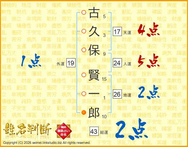 古久保賢一郎さんの地運は26画の2点!