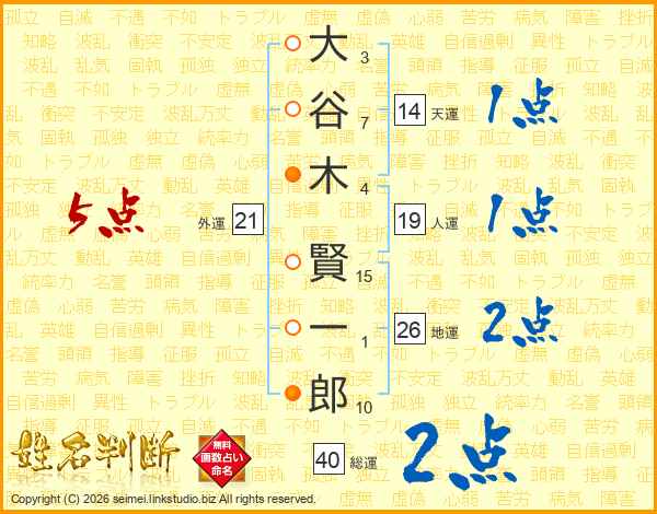 大(3画)谷(7画)木(4画) 賢(15画)一(1画)郎(10画)