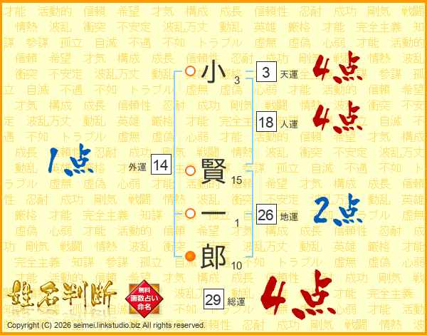 生活面を象徴する運勢です。外部から受ける影響力を表し、結婚運、家庭運や職場、環境への順応性を表します。総運から人運を引いた画数。姓や名が1文字の場合を除く。