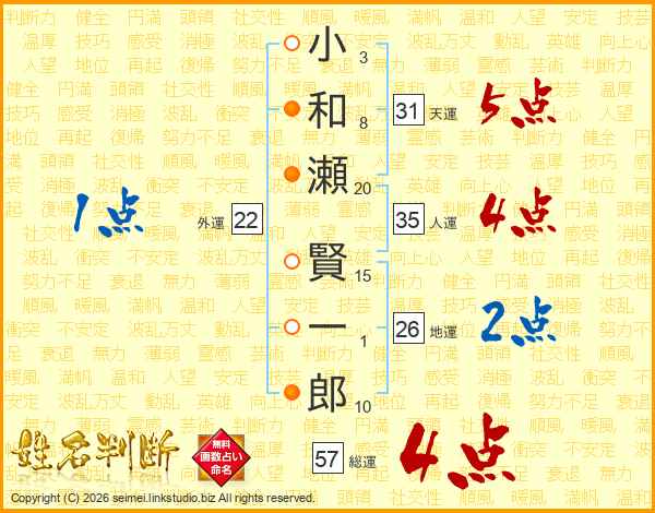 小(3画)和(8画)瀬(20画) 賢(15画)一(1画)郎(10画)