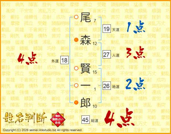 尾(7画)森(12画) 賢(15画)一(1画)郎(10画)