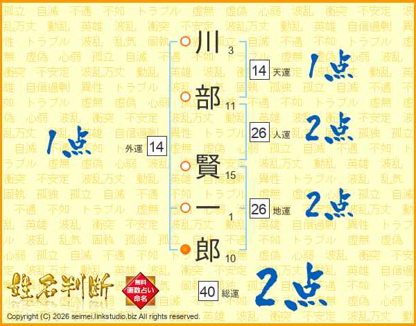 川(3画)部(11画) 賢(15画)一(1画)郎(10画)