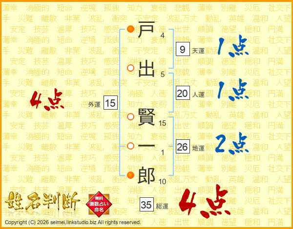 戸(4画)出(5画) 賢(15画)一(1画)郎(10画)