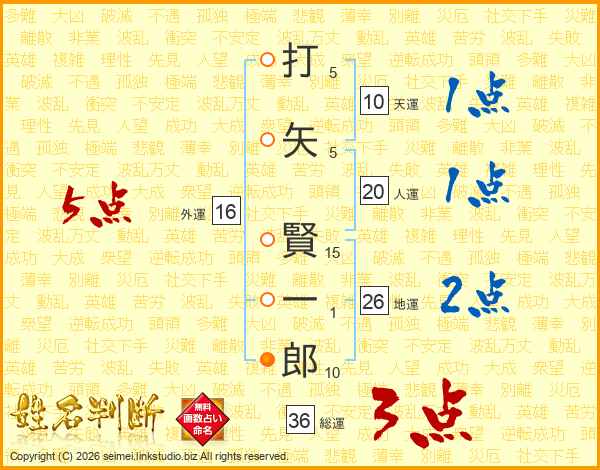 打(5画)矢(5画) 賢(15画)一(1画)郎(10画)
