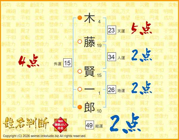 木(4画)藤(19画) 賢(15画)一(1画)郎(10画)