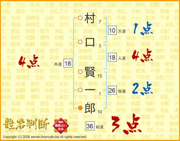 村(7画)口(3画) 賢(15画)一(1画)郎(10画)