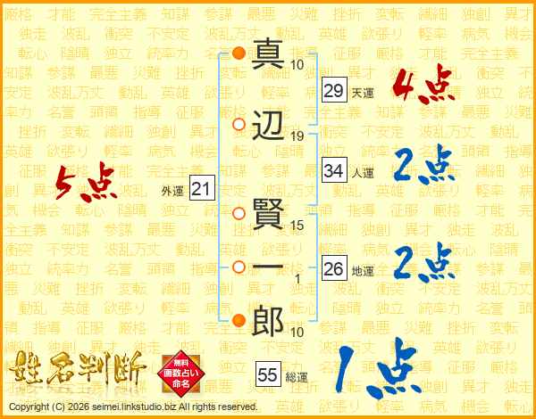 真(10画)辺(19画) 賢(15画)一(1画)郎(10画)