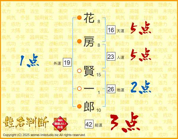 花(8画)房(8画) 賢(15画)一(1画)郎(10画)