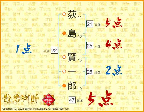 荻(11画)島(10画) 賢(15画)一(1画)郎(10画)