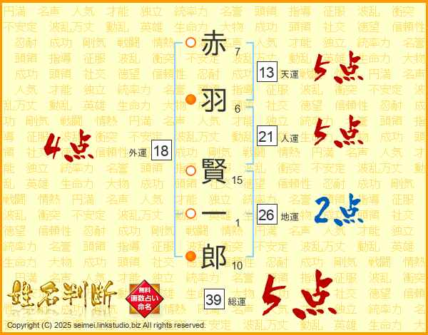 赤(7画)羽(6画) 賢(15画)一(1画)郎(10画)