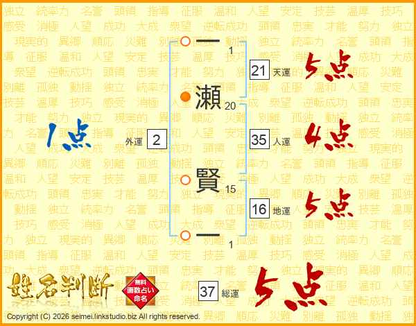 一(1画)瀬(20画) 賢(15画)一(1画)