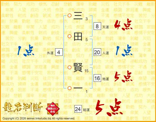 生活面を象徴する運勢です。外部から受ける影響力を表し、結婚運、家庭運や職場、環境への順応性を表します。総運から人運を引いた画数。姓や名が1文字の場合を除く。