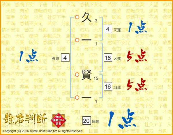 久一賢一さんの総運は20画の1点!