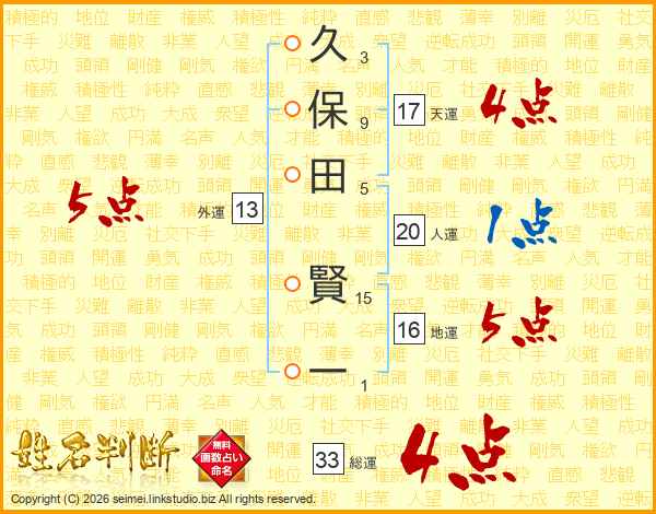 久(3画)保(9画)田(5画) 賢(15画)一(1画)