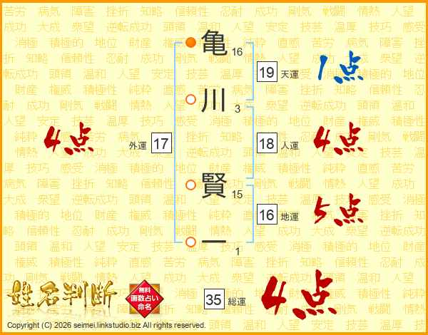 生活面を象徴する運勢です。外部から受ける影響力を表し、結婚運、家庭運や職場、環境への順応性を表します。総運から人運を引いた画数。姓や名が1文字の場合を除く。