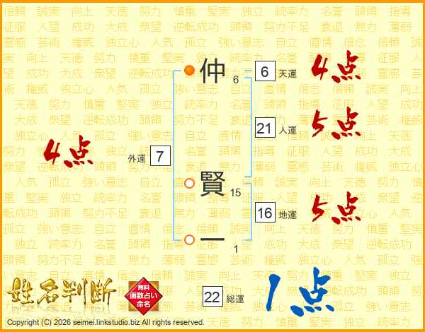 生活面を象徴する運勢です。外部から受ける影響力を表し、結婚運、家庭運や職場、環境への順応性を表します。総運から人運を引いた画数。姓や名が1文字の場合を除く。