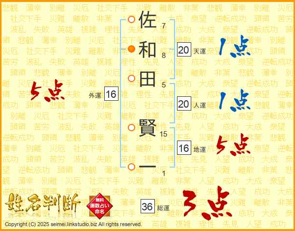 佐(7画)和(8画)田(5画) 賢(15画)一(1画)
