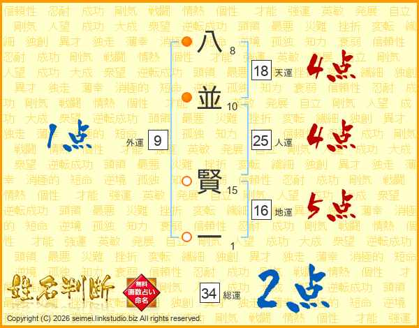 あなたの人生を表す1番重要な運勢です。生涯を通じて影響する総合運となり、主に50歳以降の晩年期に影響を及ぼします。苗字と名前の合計画数。