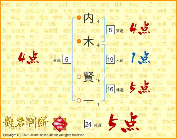 生活面を象徴する運勢です。外部から受ける影響力を表し、結婚運、家庭運や職場、環境への順応性を表します。総運から人運を引いた画数。姓や名が1文字の場合を除く。