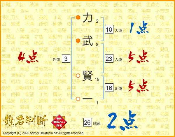 力(2画)武(8画) 賢(15画)一(1画)