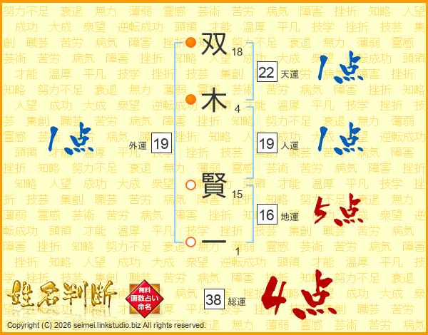 あなたの人生を表す1番重要な運勢です。生涯を通じて影響する総合運となり、主に50歳以降の晩年期に影響を及ぼします。苗字と名前の合計画数。