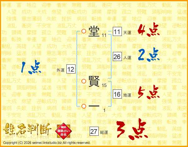 あなたの人生を表す1番重要な運勢です。生涯を通じて影響する総合運となり、主に50歳以降の晩年期に影響を及ぼします。苗字と名前の合計画数。