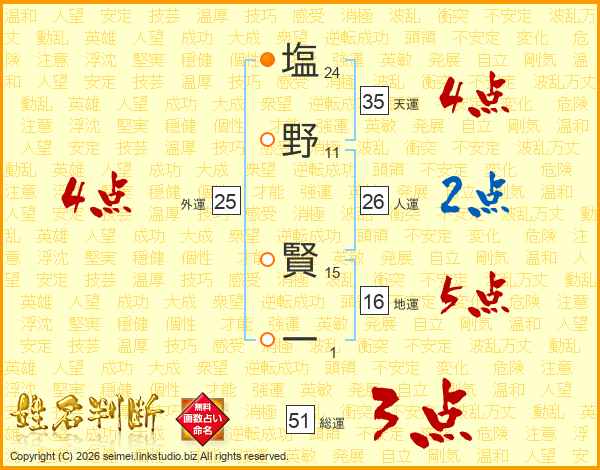 生活面を象徴する運勢です。外部から受ける影響力を表し、結婚運、家庭運や職場、環境への順応性を表します。総運から人運を引いた画数。姓や名が1文字の場合を除く。