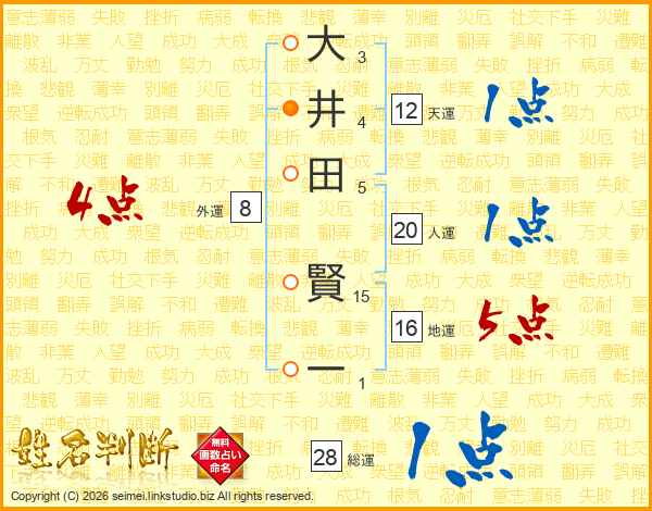 大(3画)井(4画)田(5画) 賢(15画)一(1画)