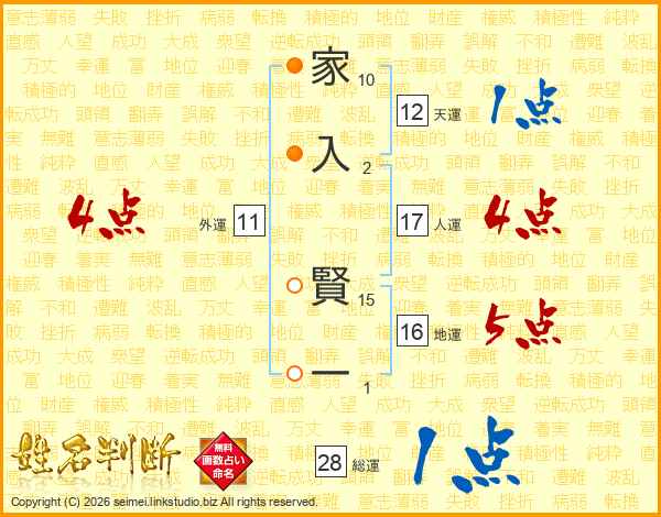 生活面を象徴する運勢です。外部から受ける影響力を表し、結婚運、家庭運や職場、環境への順応性を表します。総運から人運を引いた画数。姓や名が1文字の場合を除く。