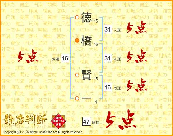徳(15画)橋(16画) 賢(15画)一(1画)