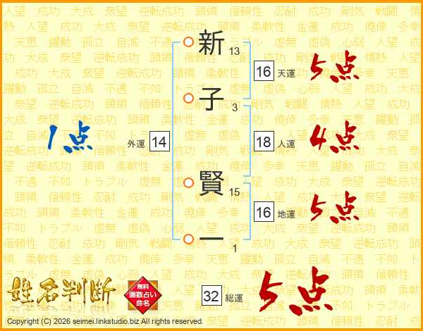 生活面を象徴する運勢です。外部から受ける影響力を表し、結婚運、家庭運や職場、環境への順応性を表します。総運から人運を引いた画数。姓や名が1文字の場合を除く。
