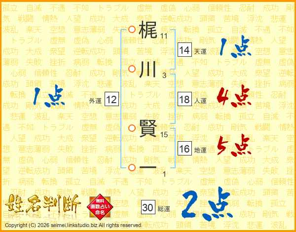 あなたの人生を表す1番重要な運勢です。生涯を通じて影響する総合運となり、主に50歳以降の晩年期に影響を及ぼします。苗字と名前の合計画数。