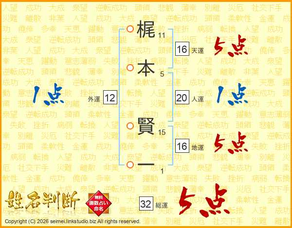 あなたの人生を表す1番重要な運勢です。生涯を通じて影響する総合運となり、主に50歳以降の晩年期に影響を及ぼします。苗字と名前の合計画数。