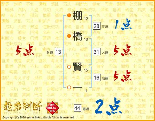 棚(12画)橋(16画) 賢(15画)一(1画)