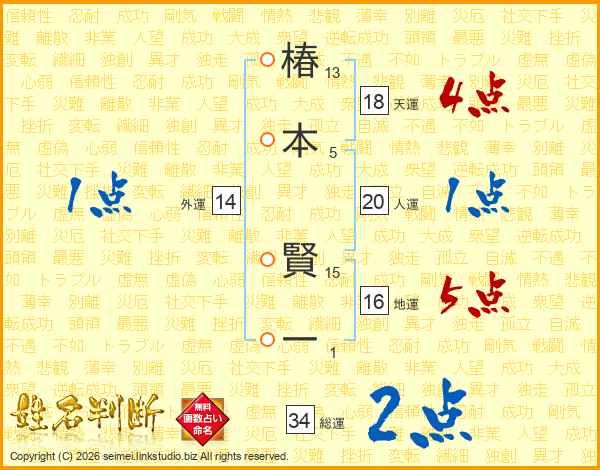 椿(13画)本(5画) 賢(15画)一(1画)