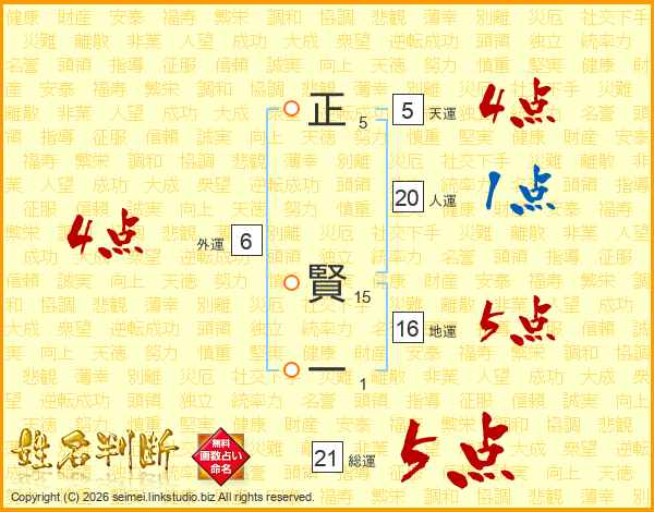 正賢一さんの総運は21画の5点!