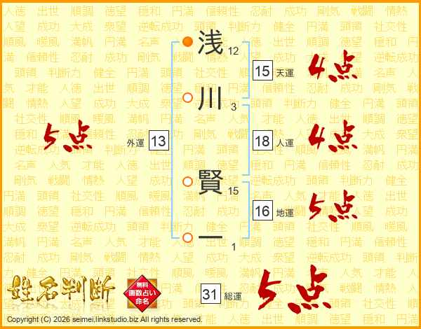 あなたの人生を表す1番重要な運勢です。生涯を通じて影響する総合運となり、主に50歳以降の晩年期に影響を及ぼします。苗字と名前の合計画数。