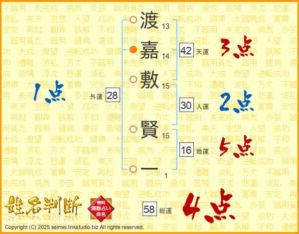 渡(13画)嘉(14画)敷(15画) 賢(15画)一(1画)