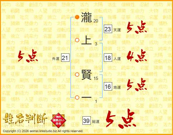 瀧(20画)上(3画) 賢(15画)一(1画)