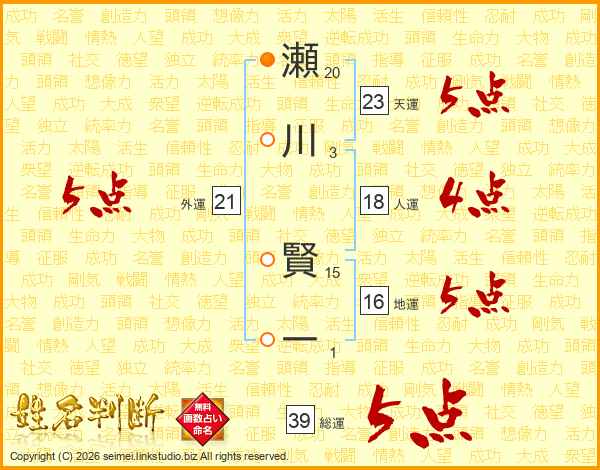 瀬川賢一さんの総運は39画の5点!