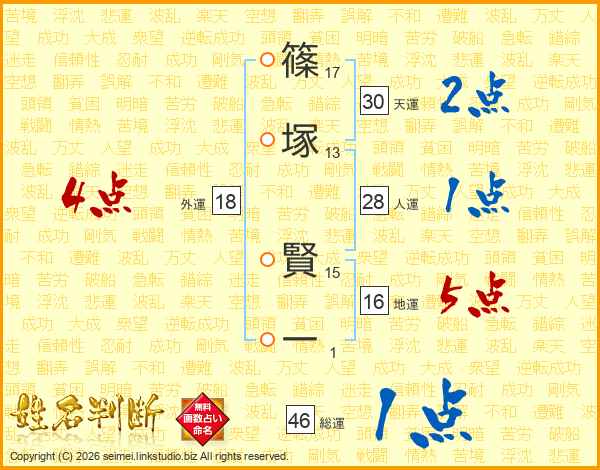 篠(17画)塚(13画) 賢(15画)一(1画)